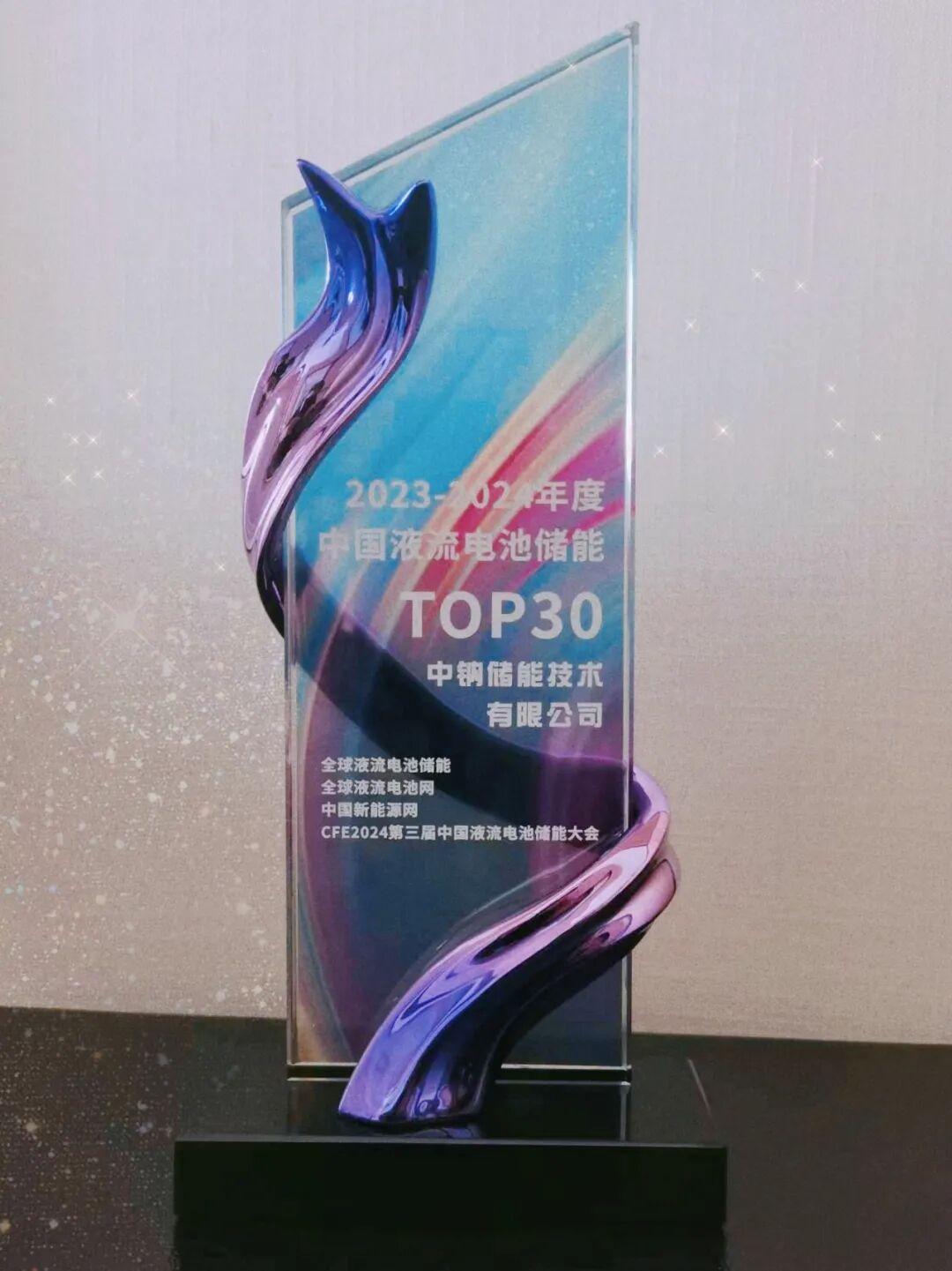 中鈉儲能“中國液流電池儲能TOP30優(yōu)秀單位”獎杯