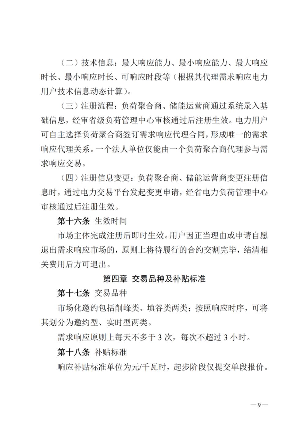 實(shí)時型響應(yīng)補(bǔ)貼:實(shí)時響應(yīng)補(bǔ)貼標(biāo)準(zhǔn)執(zhí)行全年統(tǒng)一價(jià)格2.5元/千瓦時。邀約型響應(yīng)補(bǔ)貼:削峰類響應(yīng)補(bǔ)貼標(biāo)準(zhǔn)的上下限分別為5元/千瓦時、0元/千瓦時;填谷類響應(yīng)補(bǔ)貼標(biāo)準(zhǔn)的上下限起步階段分別暫定為1元/千瓦時、0元/千瓦時。